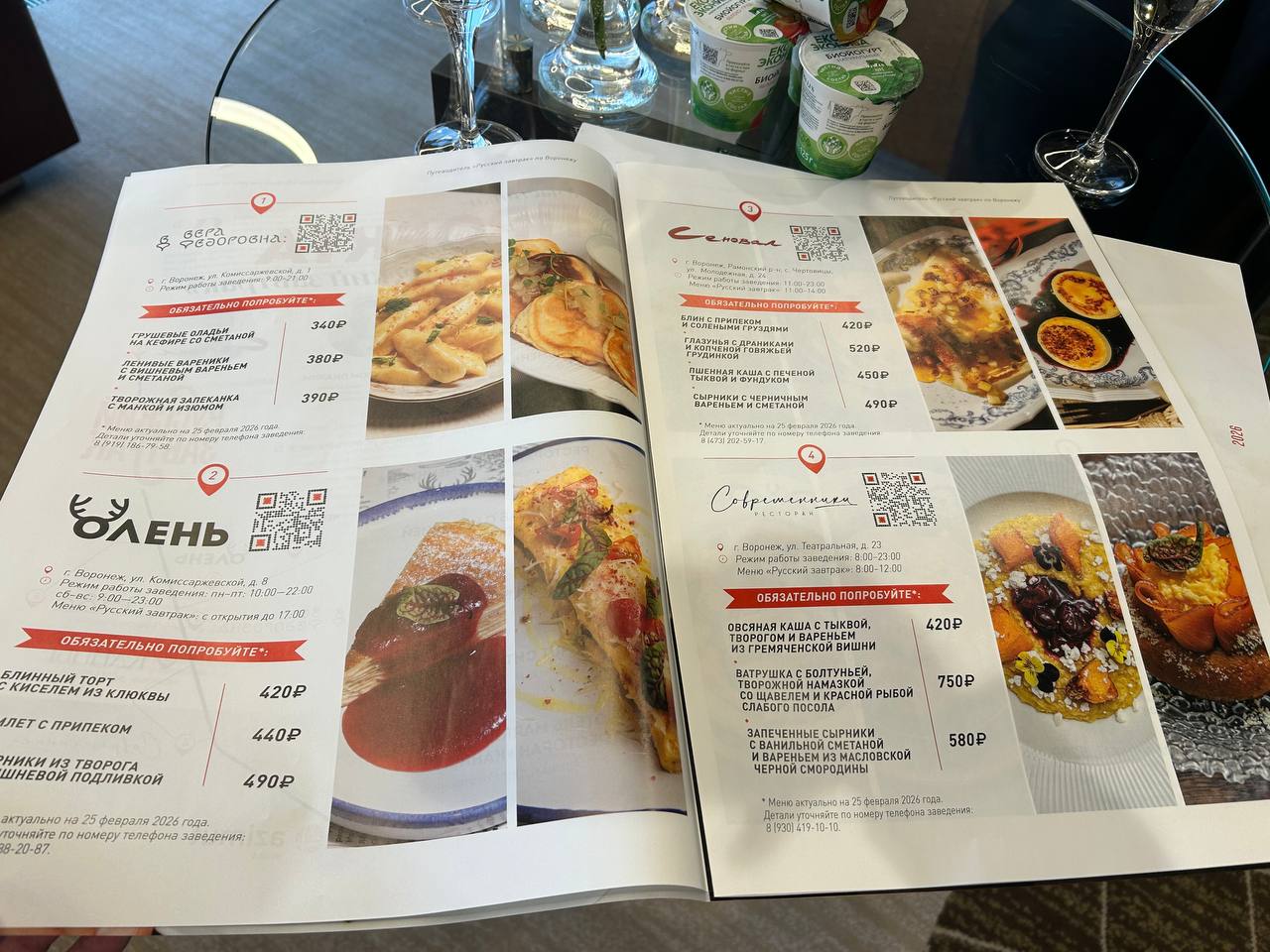 Отдельного внимания заслуживает сам печатный гид: на разворотах – крупные фотографии, QR‑коды заведений, адреса и подписи к блюдам. В кафе «Вера Федоровна» это, например, грушевые оладьи на кефире со сметаной, ленивые вареники и творожная запеканка с маком и изюмом. Пельмень‑бар «Олень» делает ставку на блины и творог – блинный торт с киселем из клюквы, омлет с припеком и сырники с вишневой подливкой. В ресторане «Сеновал» – блюда в печеном ключе: гречневая каша с фермерскими продуктами, запеченный творог и вариации на тему яиц и сыра. В «Современниках» акцент сделан на десертах и кашах: овсянка с тыквой, творогом и вареньем из гремяченской вишни, ватрушка с брусникой и запеченные сырники с ванильным соусом и черной смородиной. В список также вошли гастро‑паб с историей «Черная река», ресторан «Энсо: Созерцание», ресторан «15/86», а также завтраки в AZIMUT City Hotel и Marriott Voronezh.