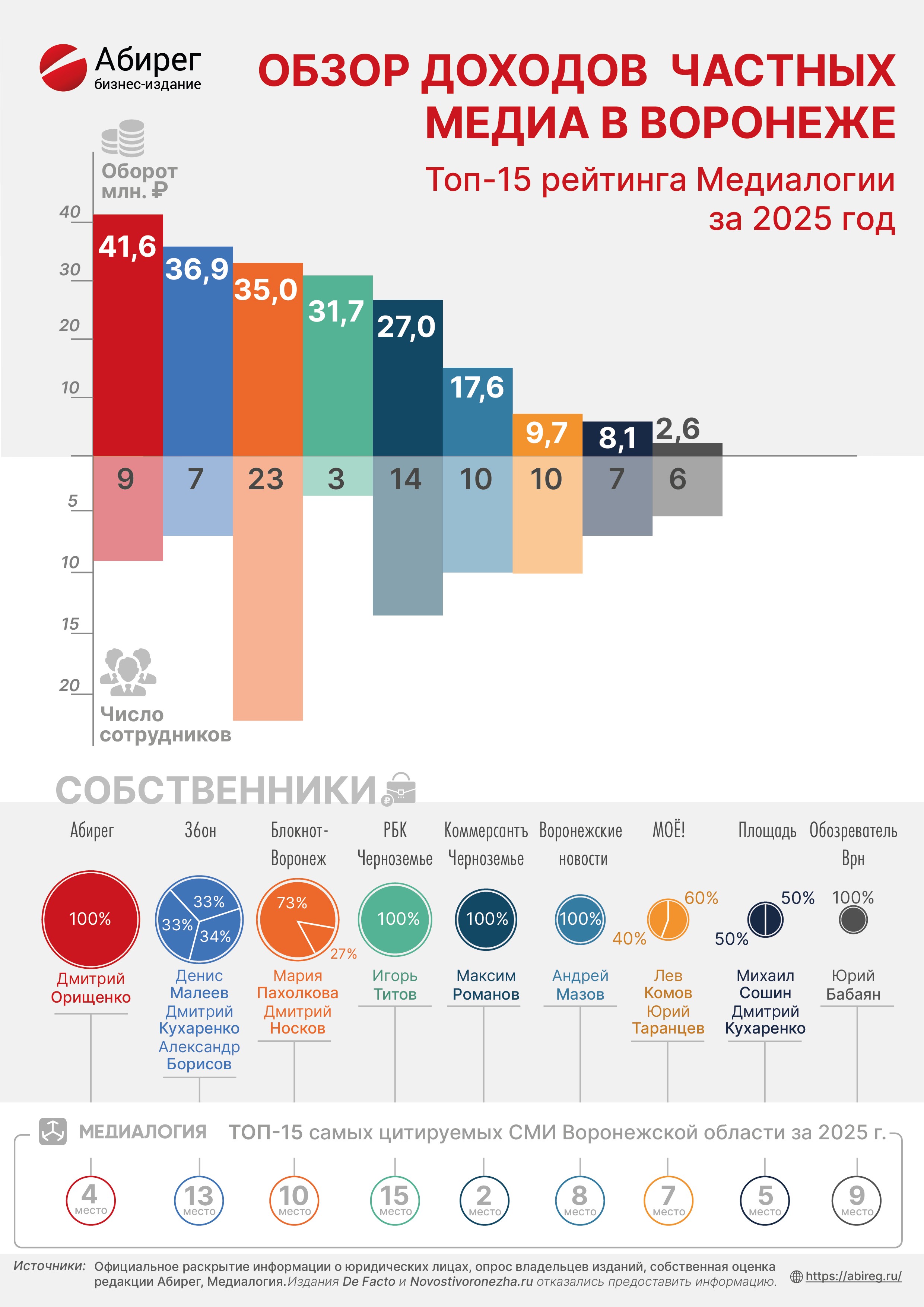 Итак, в инфографике представлены официальный оборот частных изданий за 2025 год, данные о среднесписочной численности сотрудников и владельцы изданий.